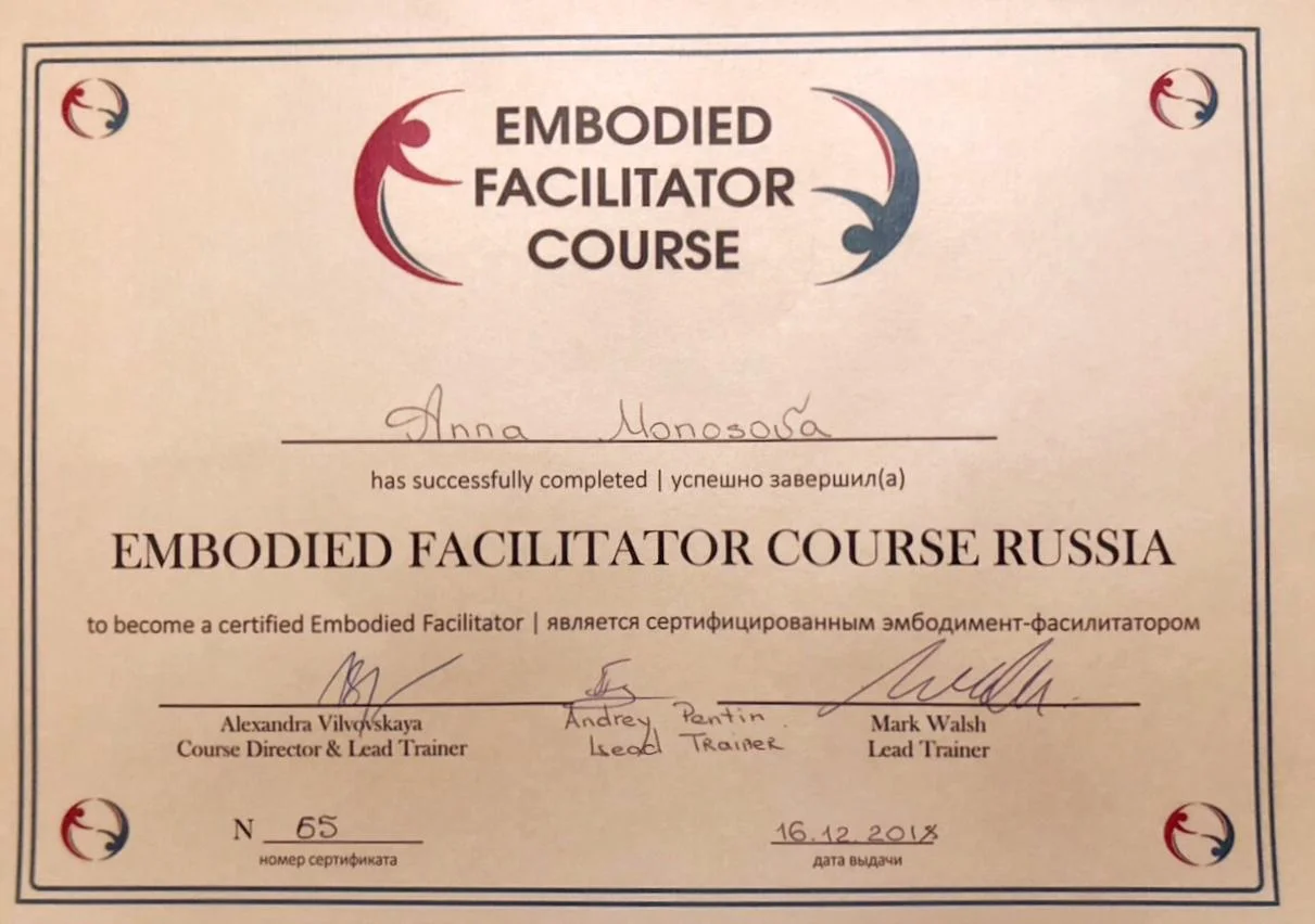 Вот мой красивый сертификат о том, что я сертифицированный эмбодимент фасилитатор.